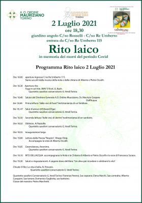 Il periodo di emergenza sanitaria ed umanitaria, causata dal Covid-19 e vissuta, in primis, dai pazienti, dai loro familiari e dagli operatori sanitari, ci ha spinto, come comunità di curanti, ad organizzare il 2 luglio 2021, nel giardino dell’ospedale Mauriziano un Rito laico quale evento collettivo di raccoglimento e condivisione, in memoria di coloro che ci hanno lasciato. E’ un progetto dell’A.O. Ordine Mauriziano (Dr. Maurizio Gaspare dall’Acqua) a cura del gruppo salutearte mauriziano (www.salutearte.it).